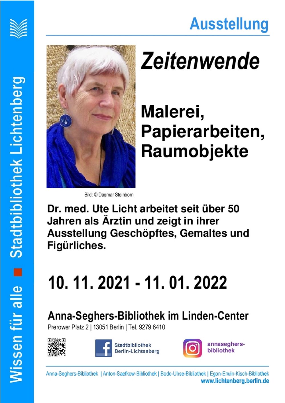 In einer neuen Einzelausstellung mit dem Thema "Zeitenwende" stelle ich in der Anna-Seghers-Bibliothek, in der ersten und dritten Etage, eine ganze Reihe meiner Arbeiten aus.