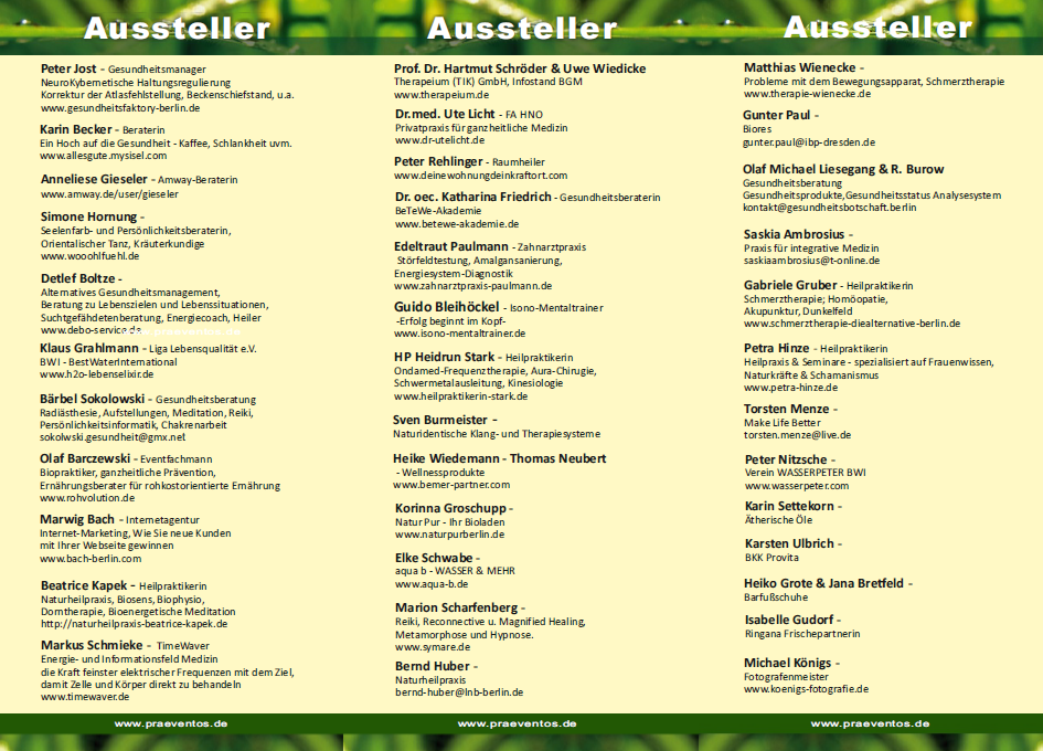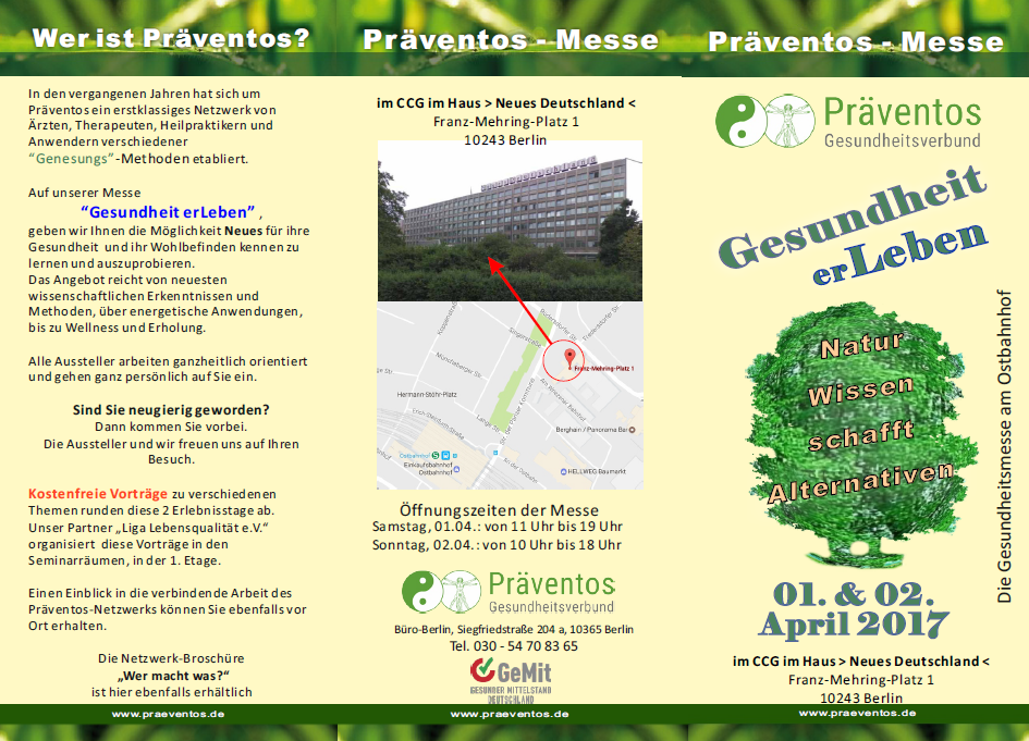 Am kommenden Wochenende findet am 01.04. von 11 bis 19 Uhr und am 02.04. von 10 – 18 Uhr die Messe „Gesundheit erLeben“ im CCG im Haus „Neues Deutschland“ am Franz-Mehring-Platz 1, 10243 Berlin statt.