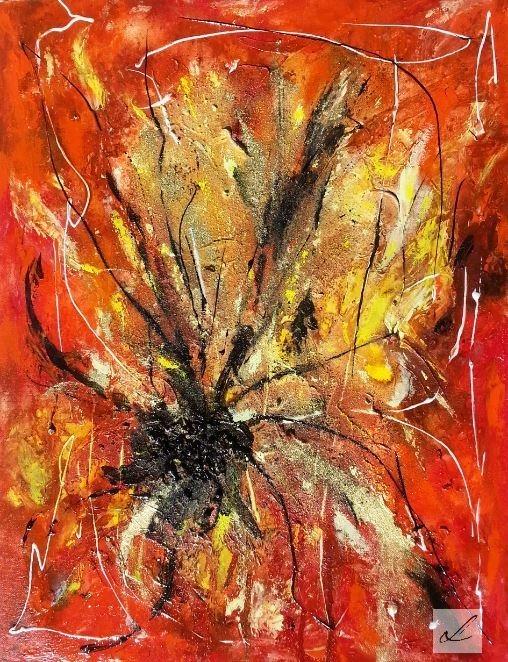 Mit dem Gedicht "Schicksalsfäden" habe ich das Bild "Phönix" Acryl und Pigmente auf Leinwand 40 x 40 x 2 cm aus der Serie "Zeitenwende" kombiniert.